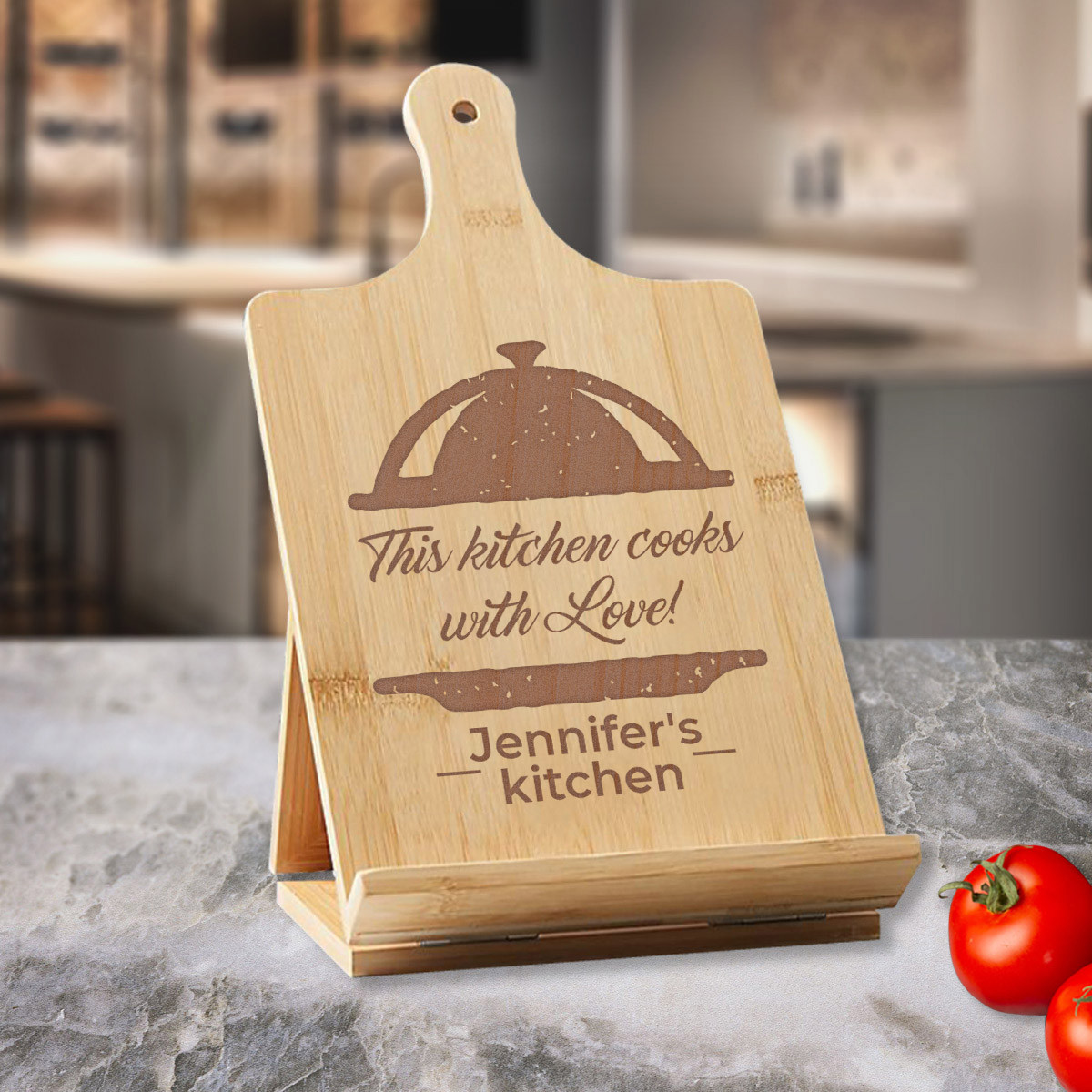 Personalized This Kitchen Cooks With Love Bamboo Standing Chef's Easel, Custom Recipe Cookbook Holder