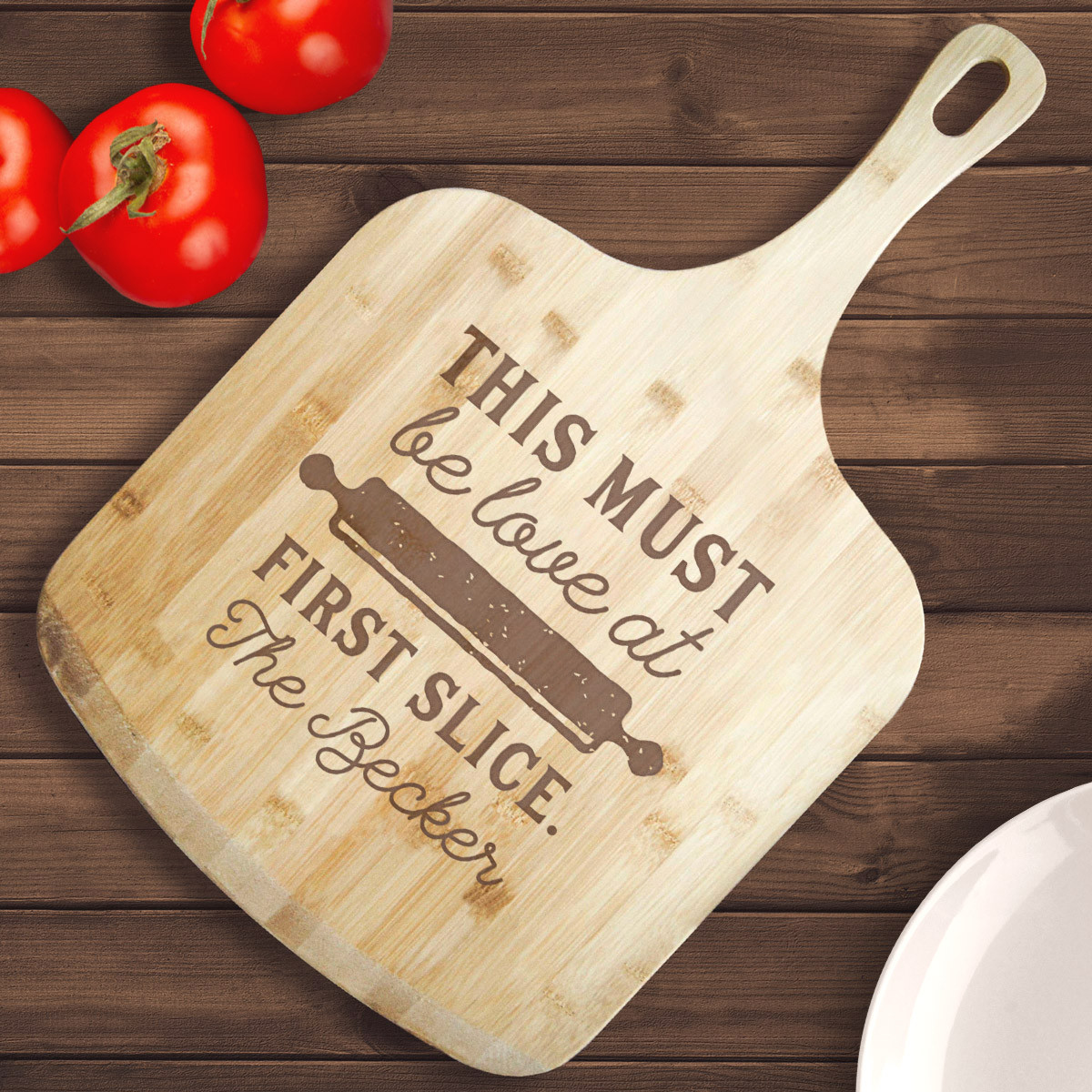 Personalized This Must Be Love At First Slice Bamboo Pizza Board With Handle, Customized Wooden Pizza Board