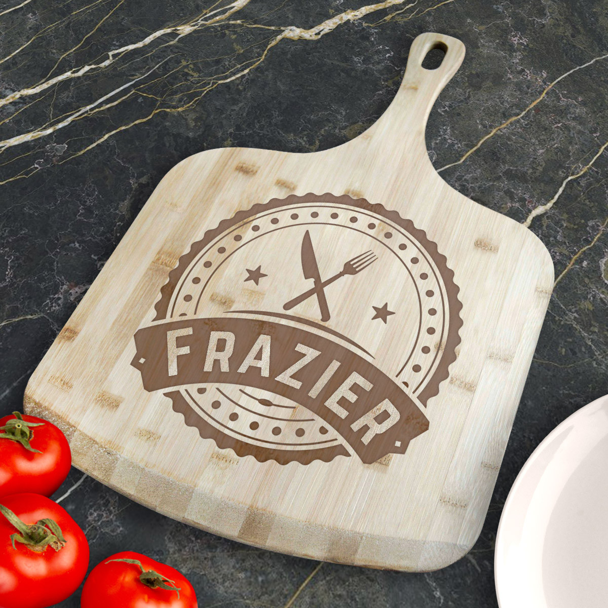 Personalized With Family Name Bamboo Pizza Board With Handle, Customized Wooden Pizza Board