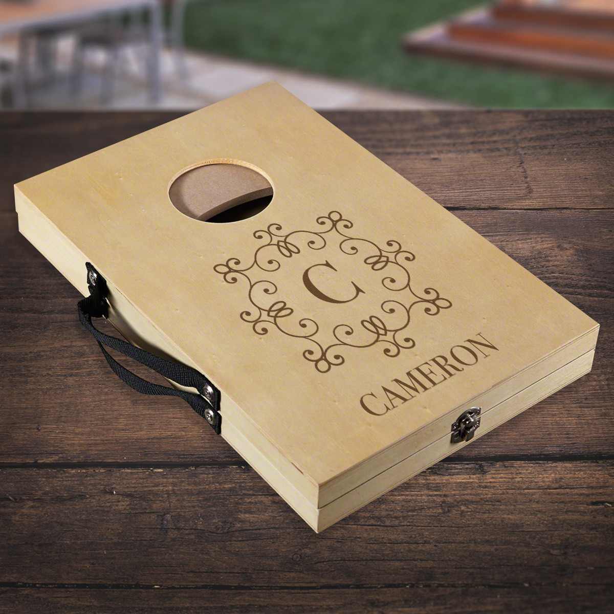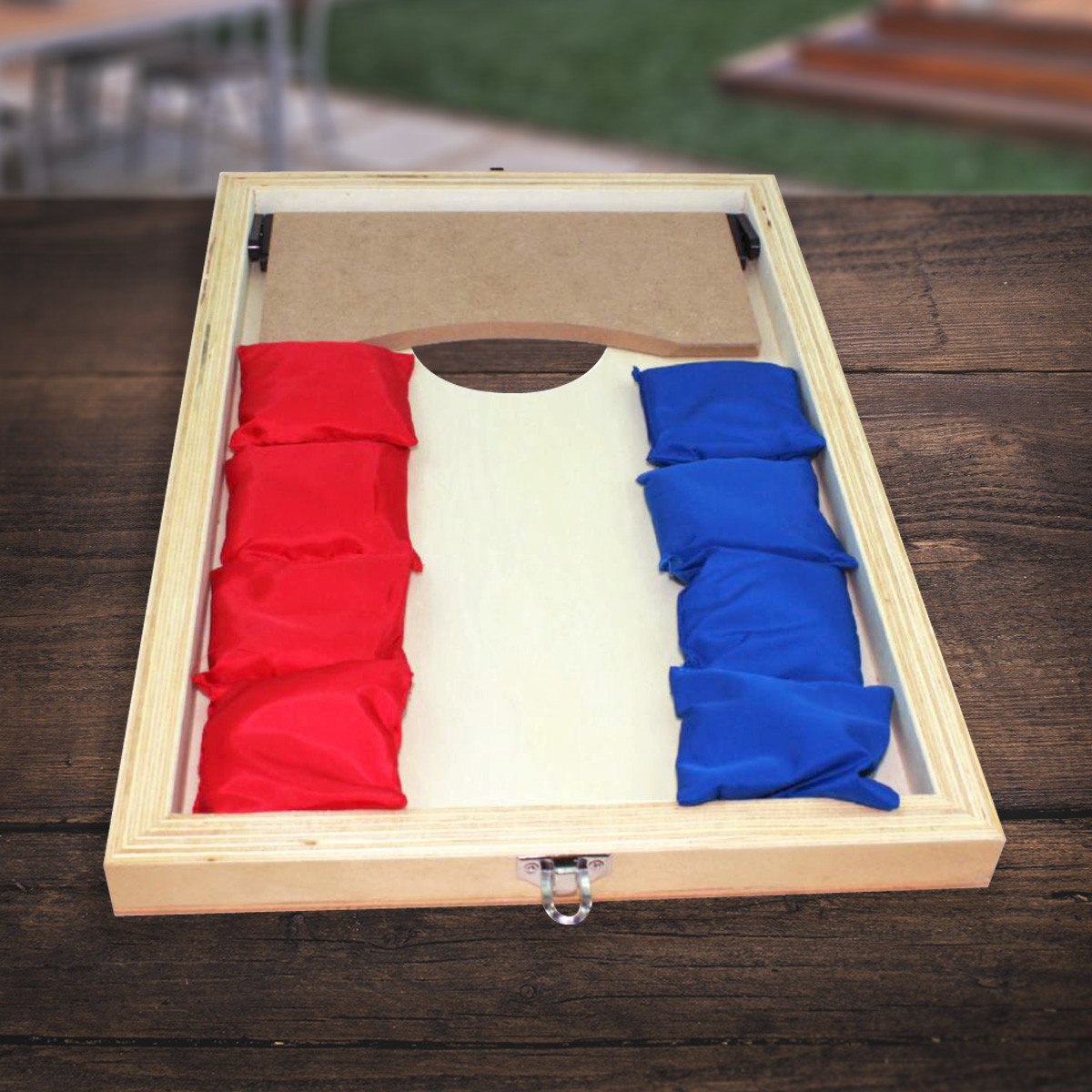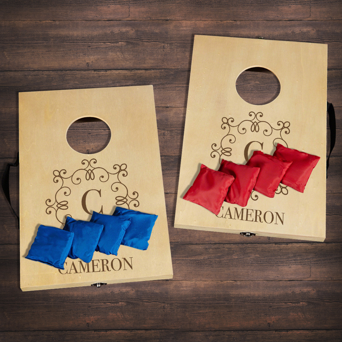 Add fun to travel and smaller indoor spaces such as living rooms, office dorms with this Personalized Mini Bean Bag Toss/Corn hole Game. This compact set will help you unplug and get active without going outdoors. The corn hole game comes with 4 red and 4 blue bean bags which are filled with sand. It has 2 boards that latch together to hold bean bags inside when the latch is closed. . This game is very convenient for travel being sturdy and portable with the attached carrying handles.