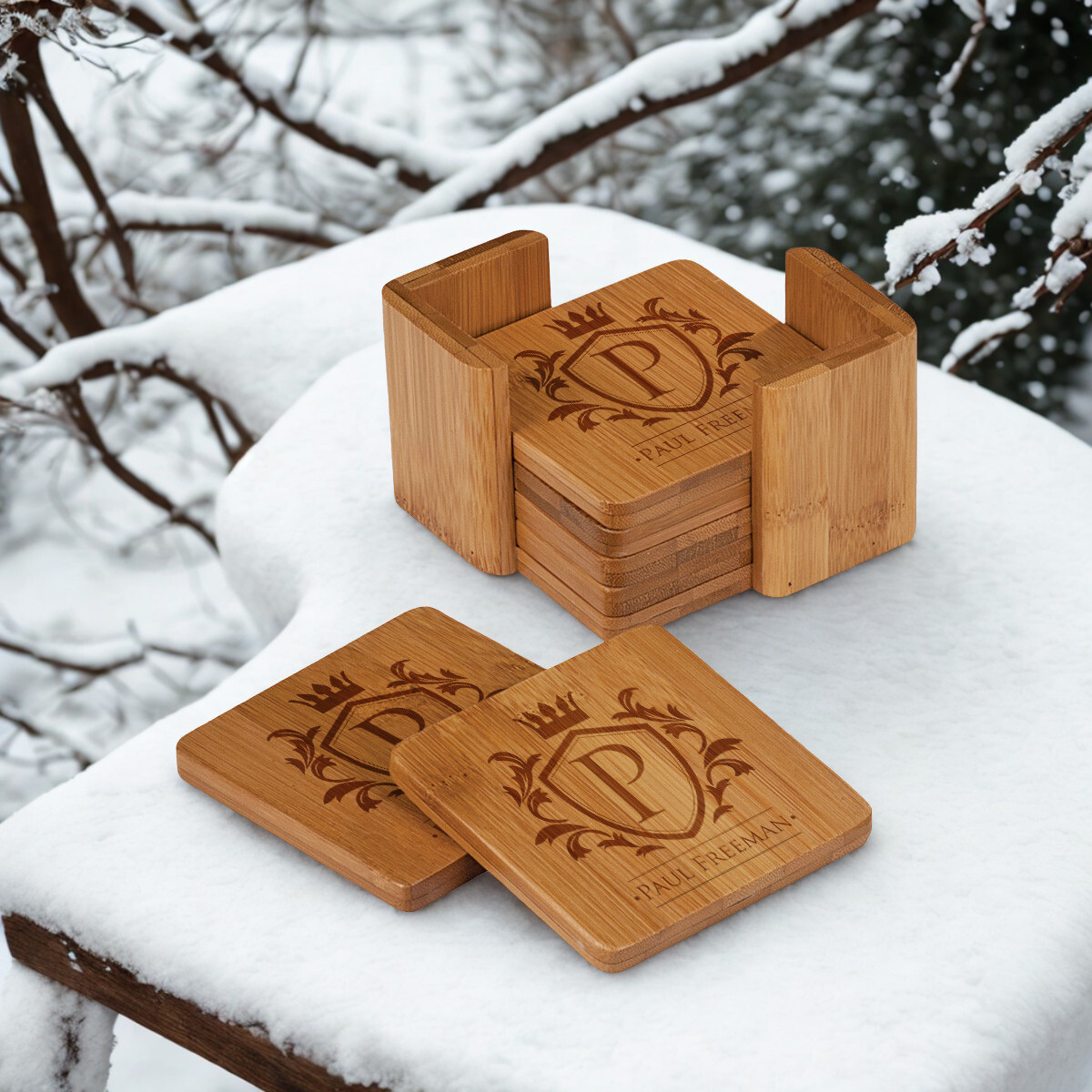 Personalized Bamboo Coaster Set of 6 with Holder, Customized Coasters