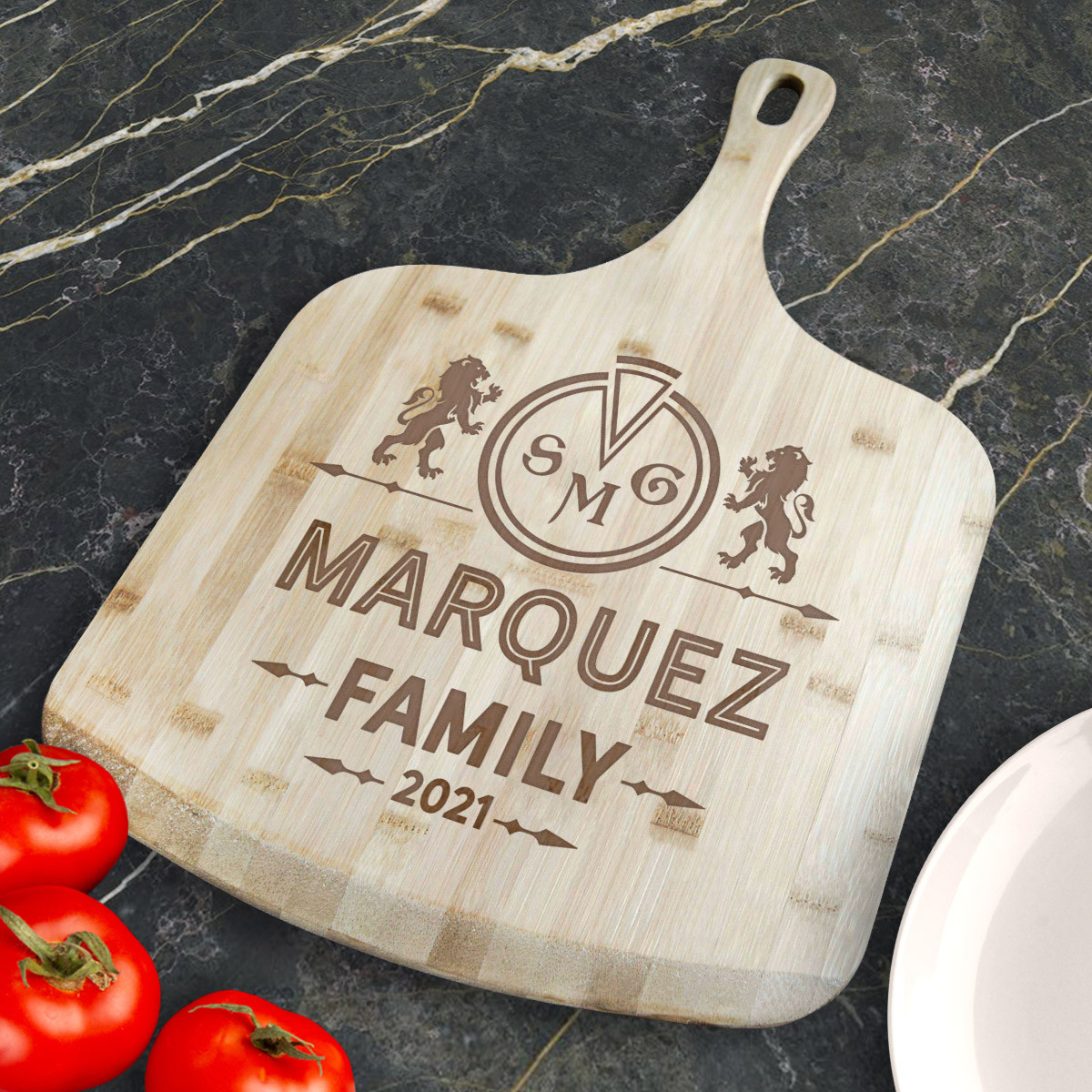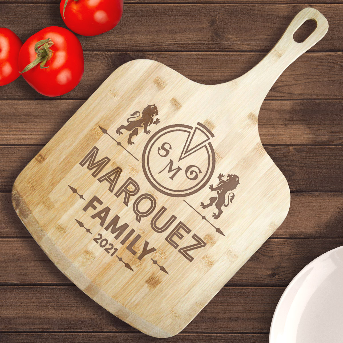 Personalized With Family Name Bamboo Pizza Board With Handle, Customized Wooden Pizza Board