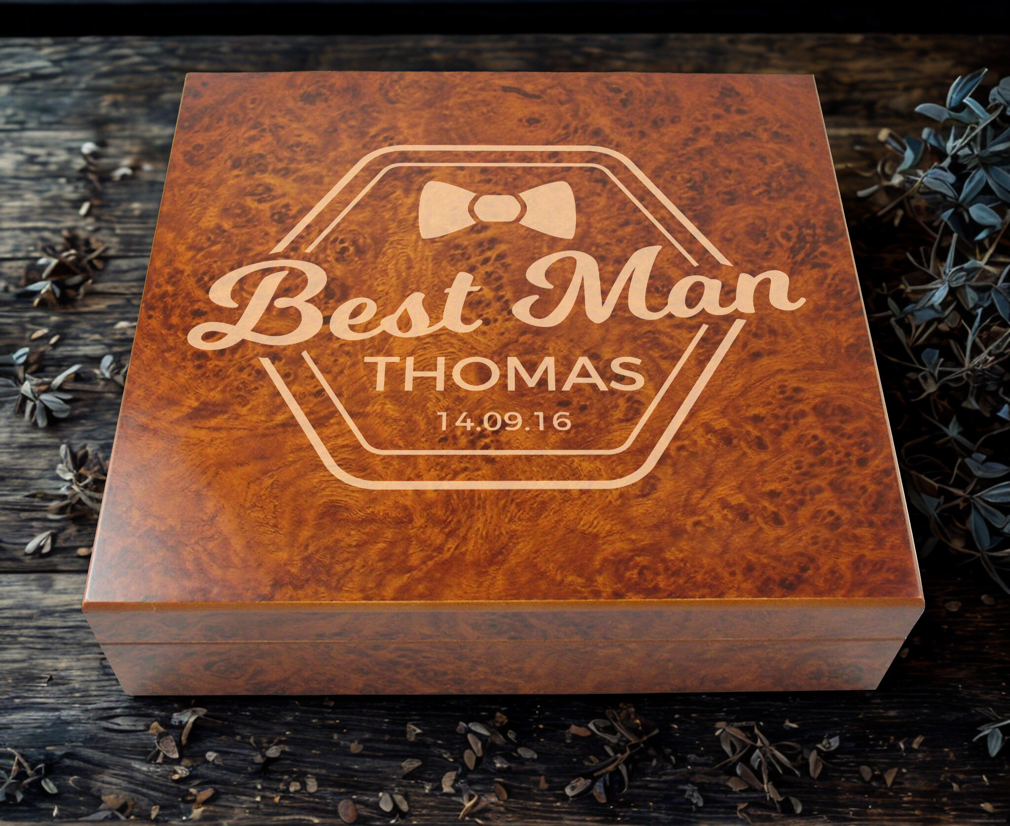 Luxurious Personalized Best Man 20 Count Burl Cigar Humidor with Humidifier