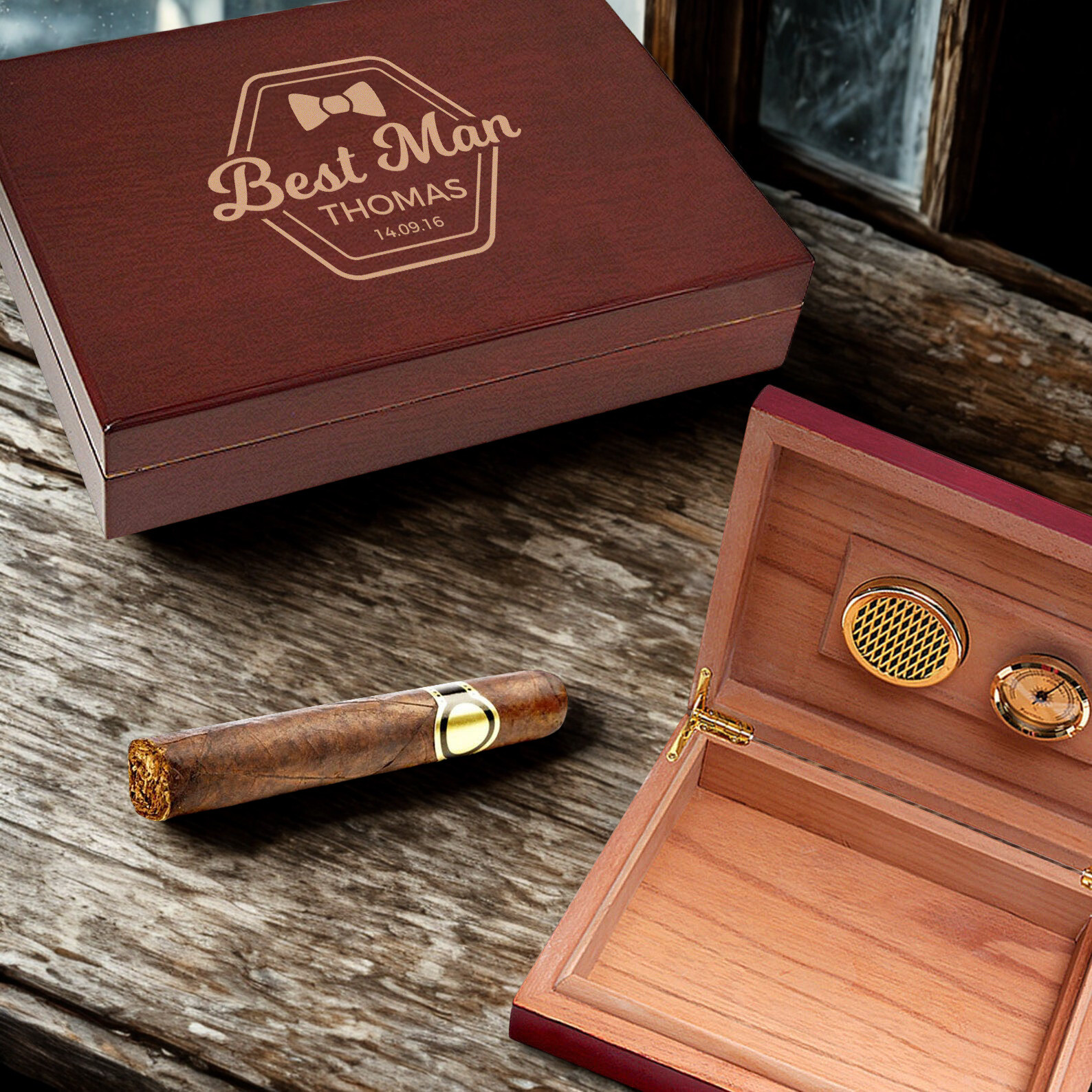 This personalized box is a beautifully crafted, large cigar humidor. It is designed for an occasional cigar smoker who cares about quality and manly looks of his humidor. It can hold maximum 20 cigars at a time. This cigar box oozes class and sophistication. It makes the perfect personalized gift for any cigar smoker. Cigars are natural products, and require special care and protection just like any other perishable item.