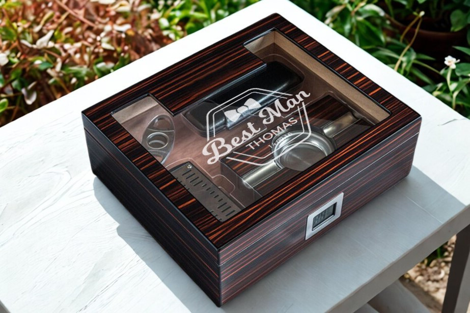 Personalized Best Man Cherry Ebony Lacquer Gift Set External Digital Hygrometer