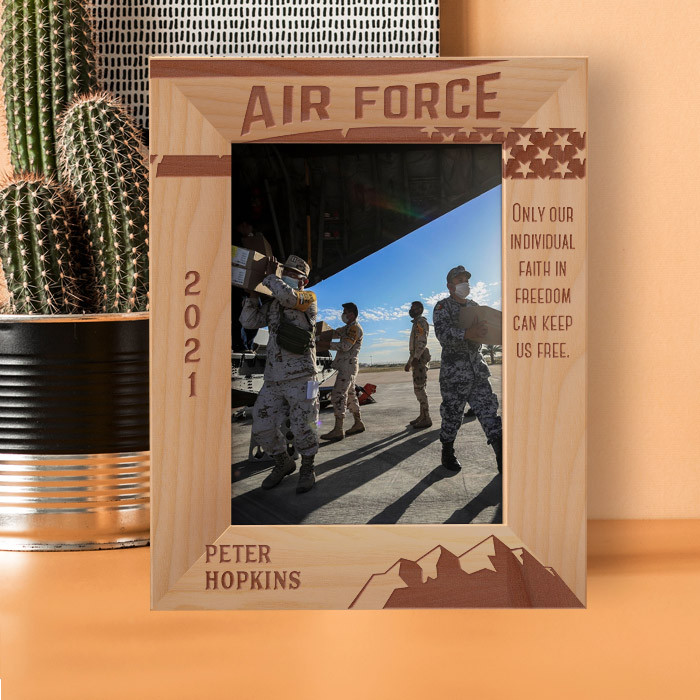This personalized air force wooden frame is an ideal gift choice because it can easily be put for table top display vertically or horizontally, and hung on the wall as well. This personalized air force frame comes in a variety of sizes and shapes too. Therefore you can display your best photograph with a high-quality frame like this one.