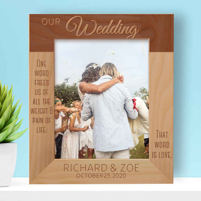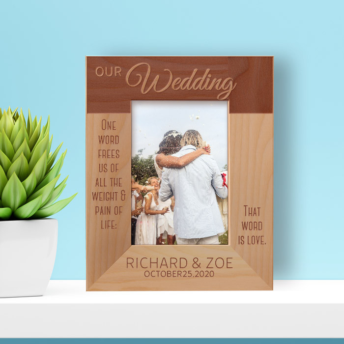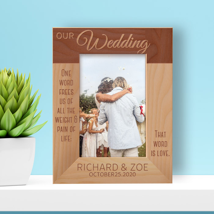 Are you looking for the perfect wedding frame? Well, this personalized wedding frame is what you need! It has a beautiful design that is unique and stylish. It is made of high-quality wood that makes it highly durable and long lasting. Your wedding photo is of great value. Therefore, you definitely need a well-crafted frame to make sure the photo is preserved. Well, this personalized wedding frame is the your best choice!