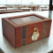 This humidor has a removable tray and 2 Spanish cider dividers. It features an external hygrometer and has bold inlay design on the forefront and lid. This handsome humidor has a high gloss finish, I large humidifier, locking hinges and gild lock and key set. It has an elegant dark mahogany finish; a sophisticated way to show off your cigar stash.