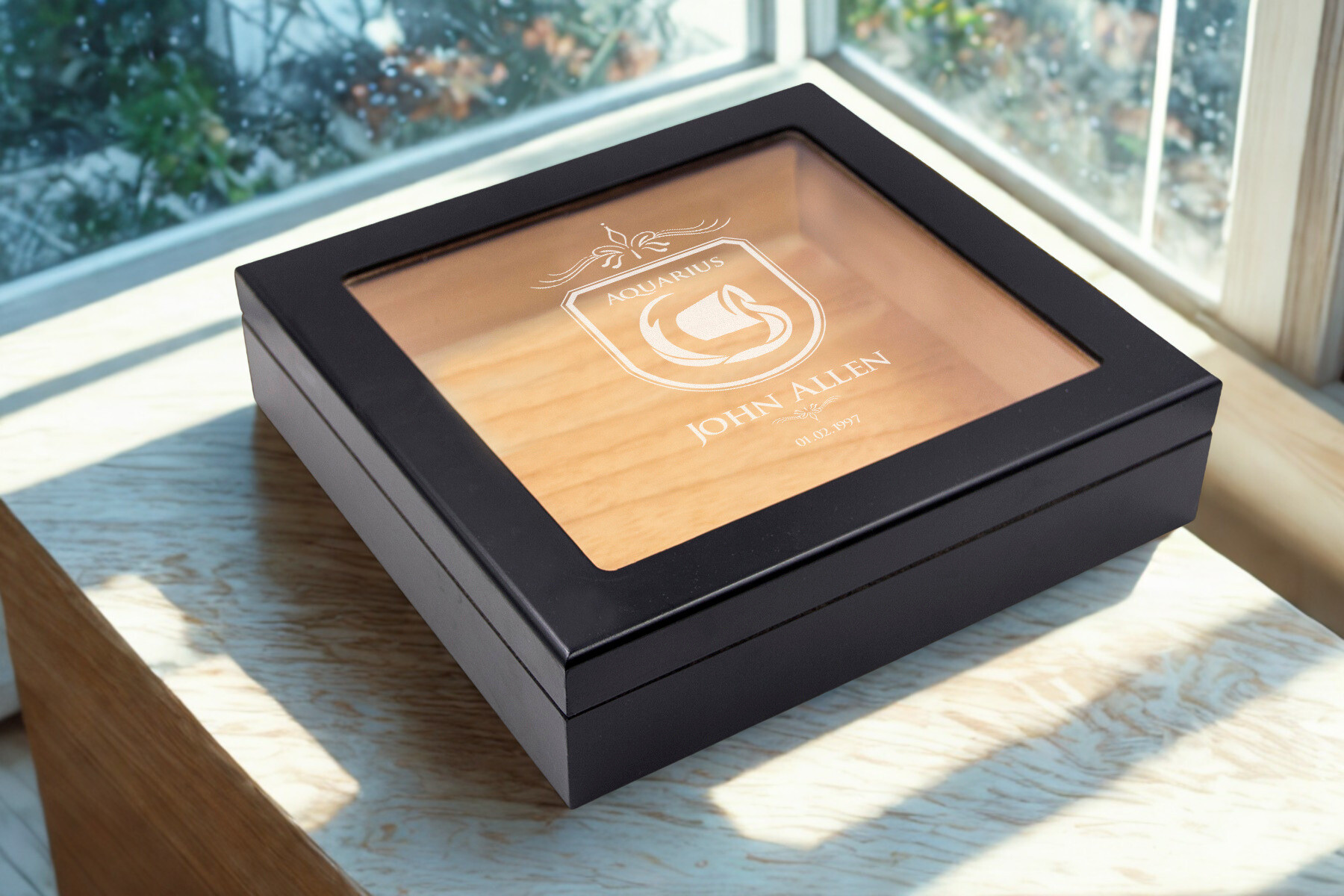 Personalized Birthday 20 Count Black Glass Top Cigar Humidor With Humidifier with Zodiac Signs