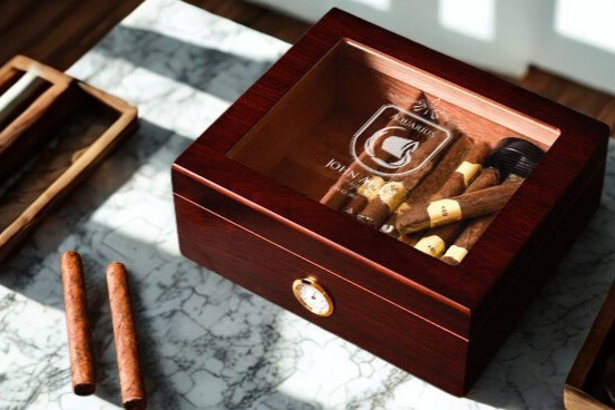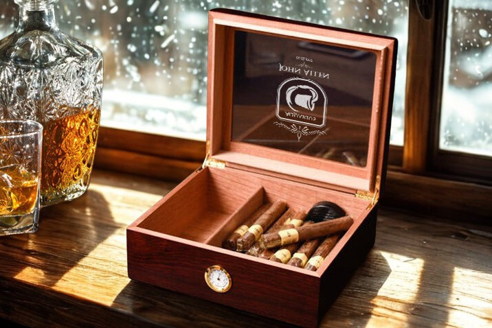 Use this chalet glass top to hold cards, photos. Cigars or other special mementos! Age your cigar properly with this Spanish cedar humidor. Featuring a humidifier, a hygrometer, a scratch-resistant felt-lined bottom, and internal locking hinges, this humidor ensures that your cigars are stored under impeccable conditions.