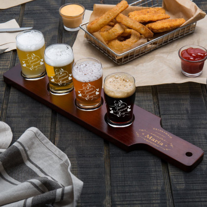 Personalized Core Beer Flight Set, 4 Beer Pub Taster Glasses with 4-Hole Red-Brown Wood Paddle