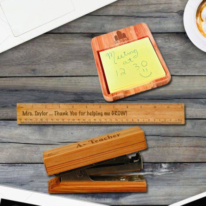 Personalized Set of Bamboo Mini Stapler, Note Holder and Ruler