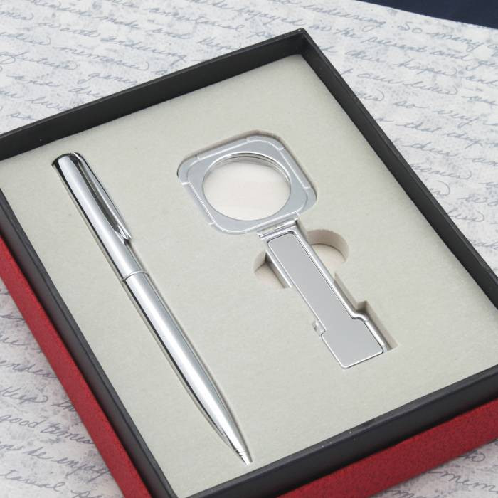 This personalized set consists of magnifying glass and pen. The magnifying glass is made with scratch resistant, shatterproof clear acrylic lens designed for seniors, students, professionals, people with low vision and macular degeneration.