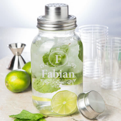 Put a fresh, new twist on the classic cocktail shaker with thisPersonalized glass mason jar bar shaker! This 3-piece shaker features a thick glass body, stainless steel strainer, and stainless steel top. Its rustic mason jar design brings an appealing vintage touch to any bar service or special event. The glass jar offers optimum clarity for your colorful bar ingredients and drink mixes.