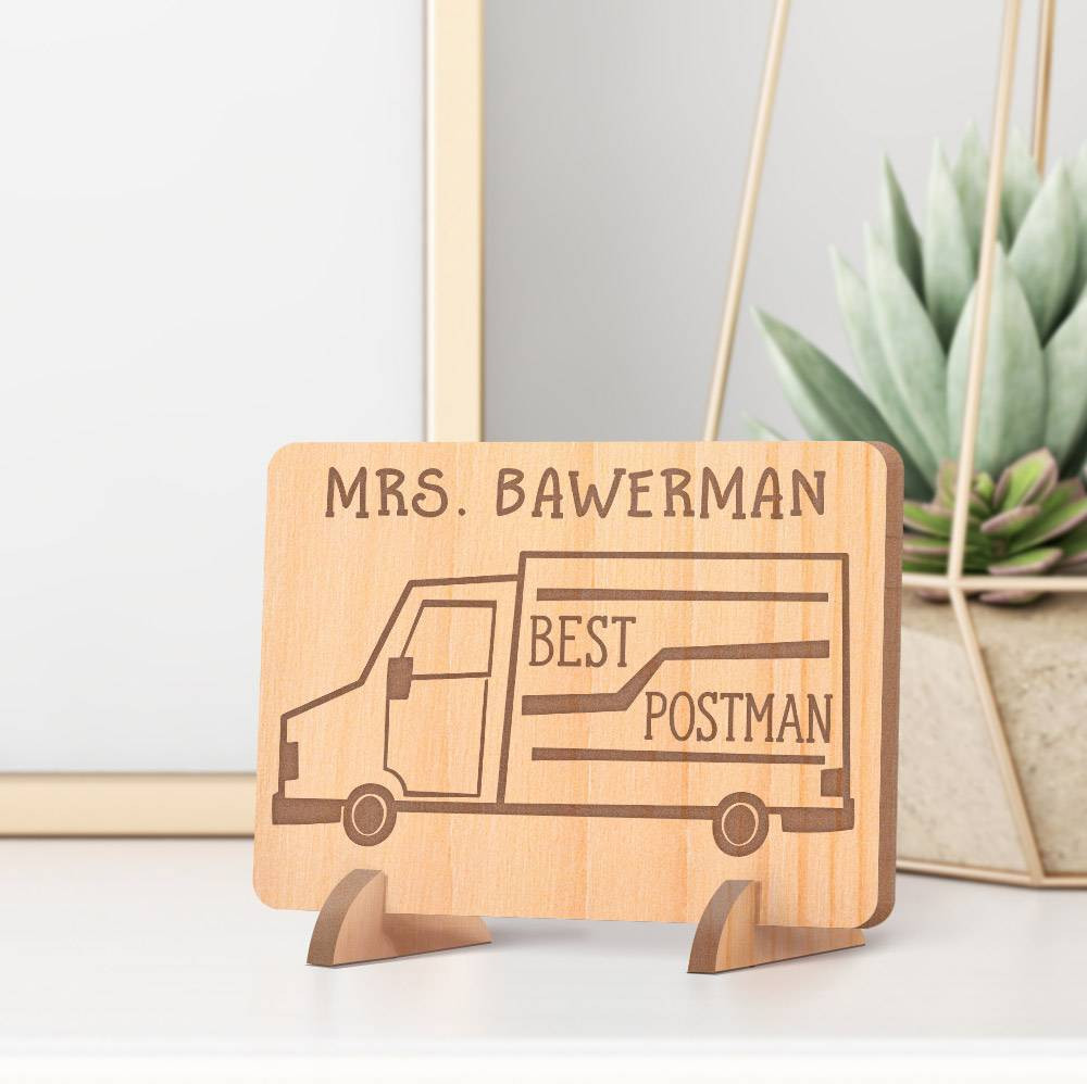 This Personalized Best Postman's Name with Delivery Van Detail is for your postman, mailman gift, mail lady or a postal worker. A perfect way to acknowledge the work to deliver your mail and bills come rain come shine. It features a mail man’s delivery van. The card is made of alder wood and can be personalized with you’re the recipient’s name and other postal graphics. Not only will this wooden card serve as a fond keepsake gift, but it can double up as house décor and will look good placed on tables, shelves, counter tops, office desk, bedside table, etc.