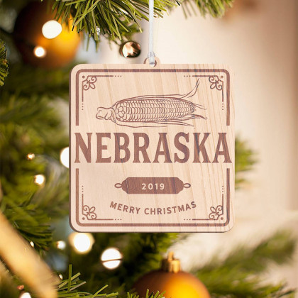The ornament is made of alder wood and has the name Nebraska and the Christmas year engraved on it for personalization. The ornament can be hung on the Christmas tree, in the mantle or the foyer.