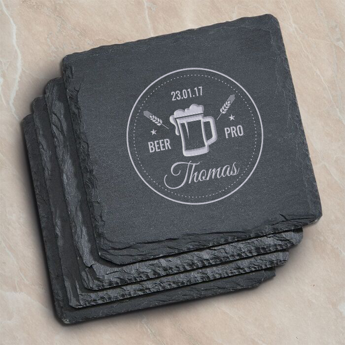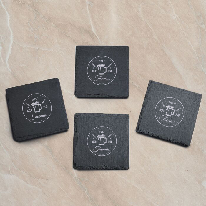 Protect your furniture from water rings with these fun personalized coasters. Constructed from slate, these coasters feature any design engraving. These customized coasters are available in a set of four and make a great gift. Protect your furniture from water rings with these fun personalized coasters.
