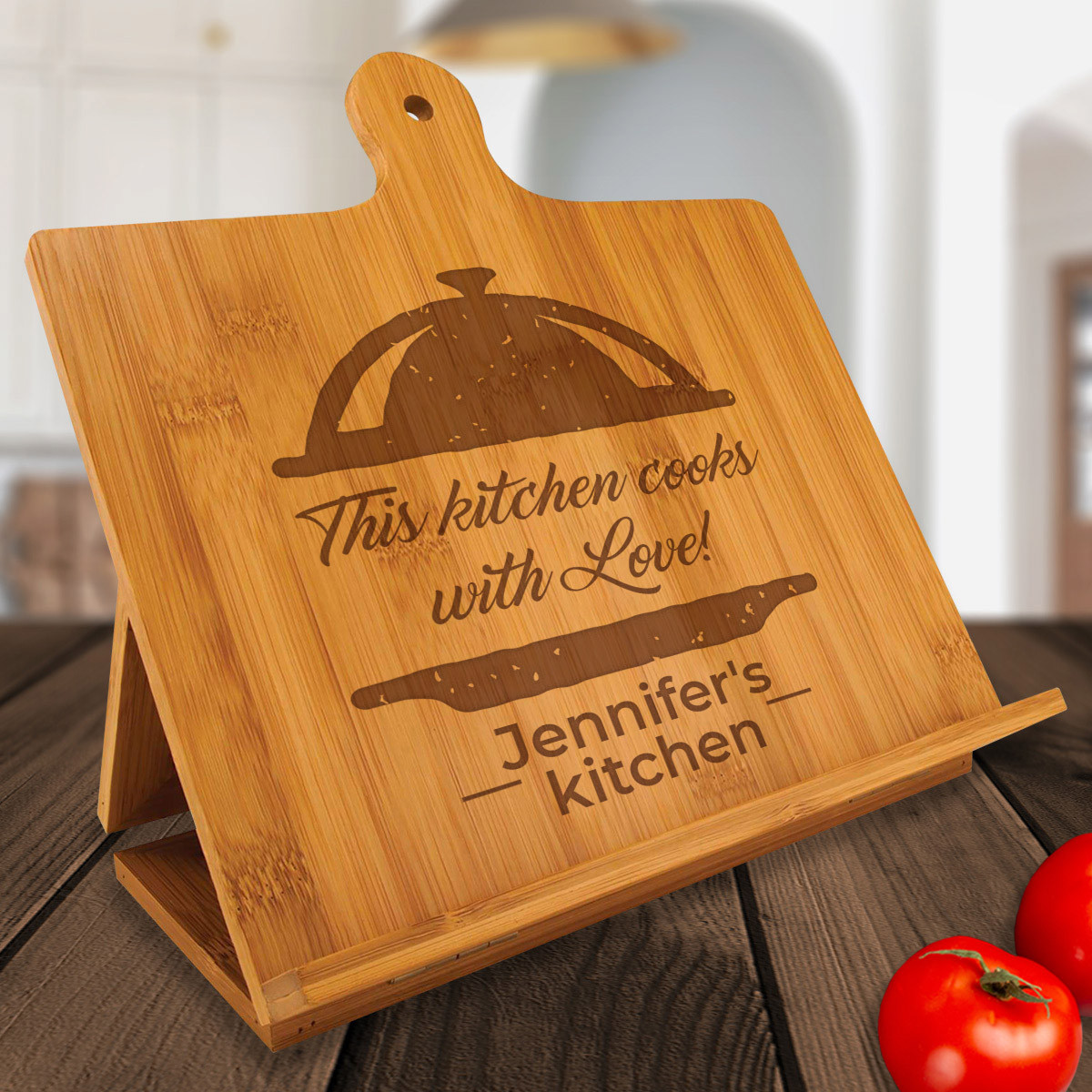 Personalized This Kitchen Cooks With Love Bamboo Standing Chef's Easel, Customized Recipe Cookbook Holder