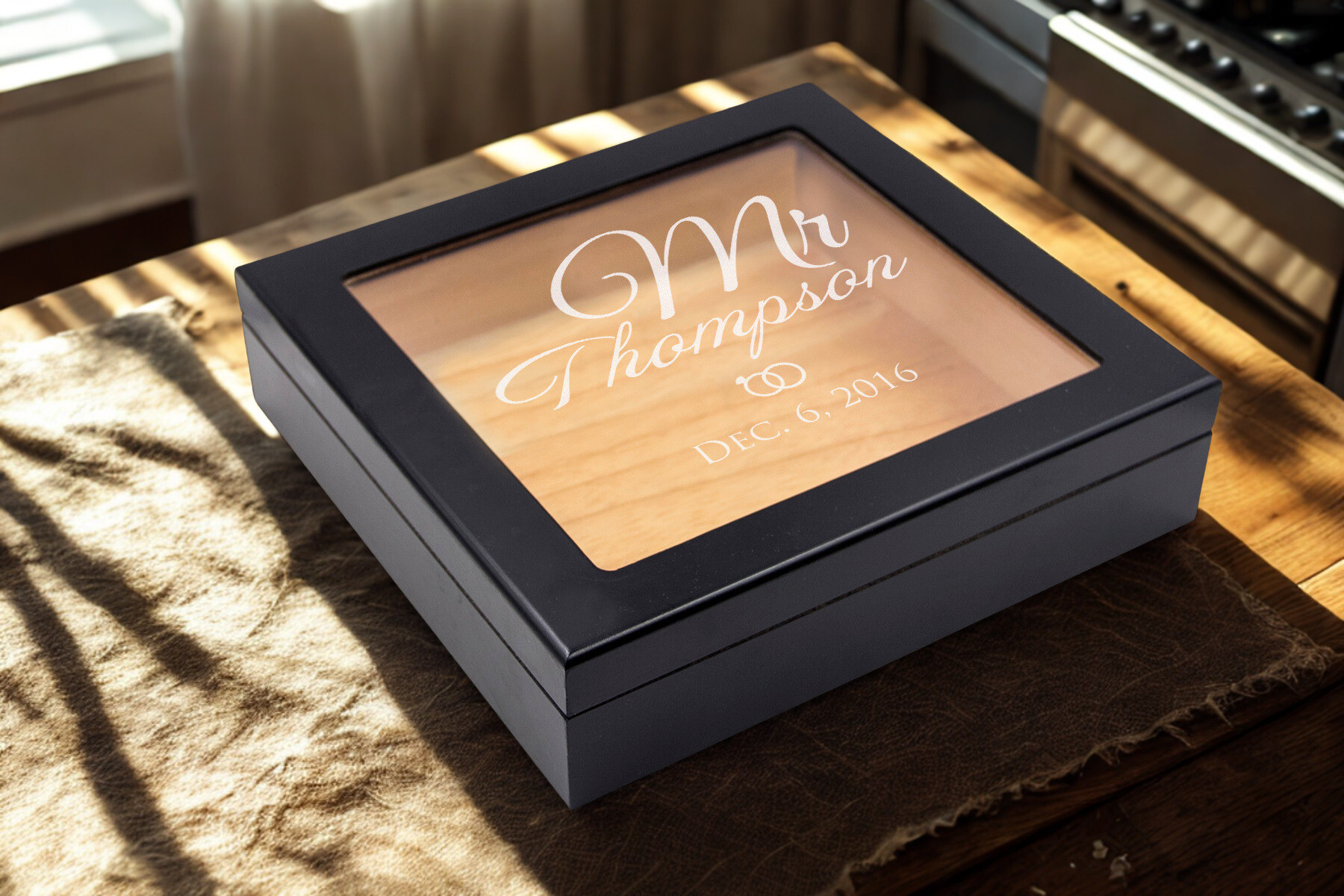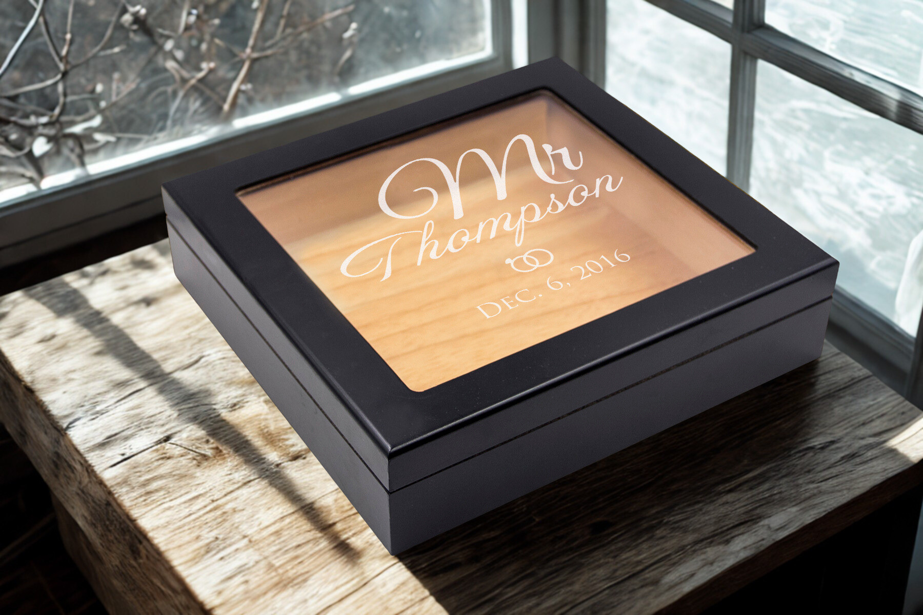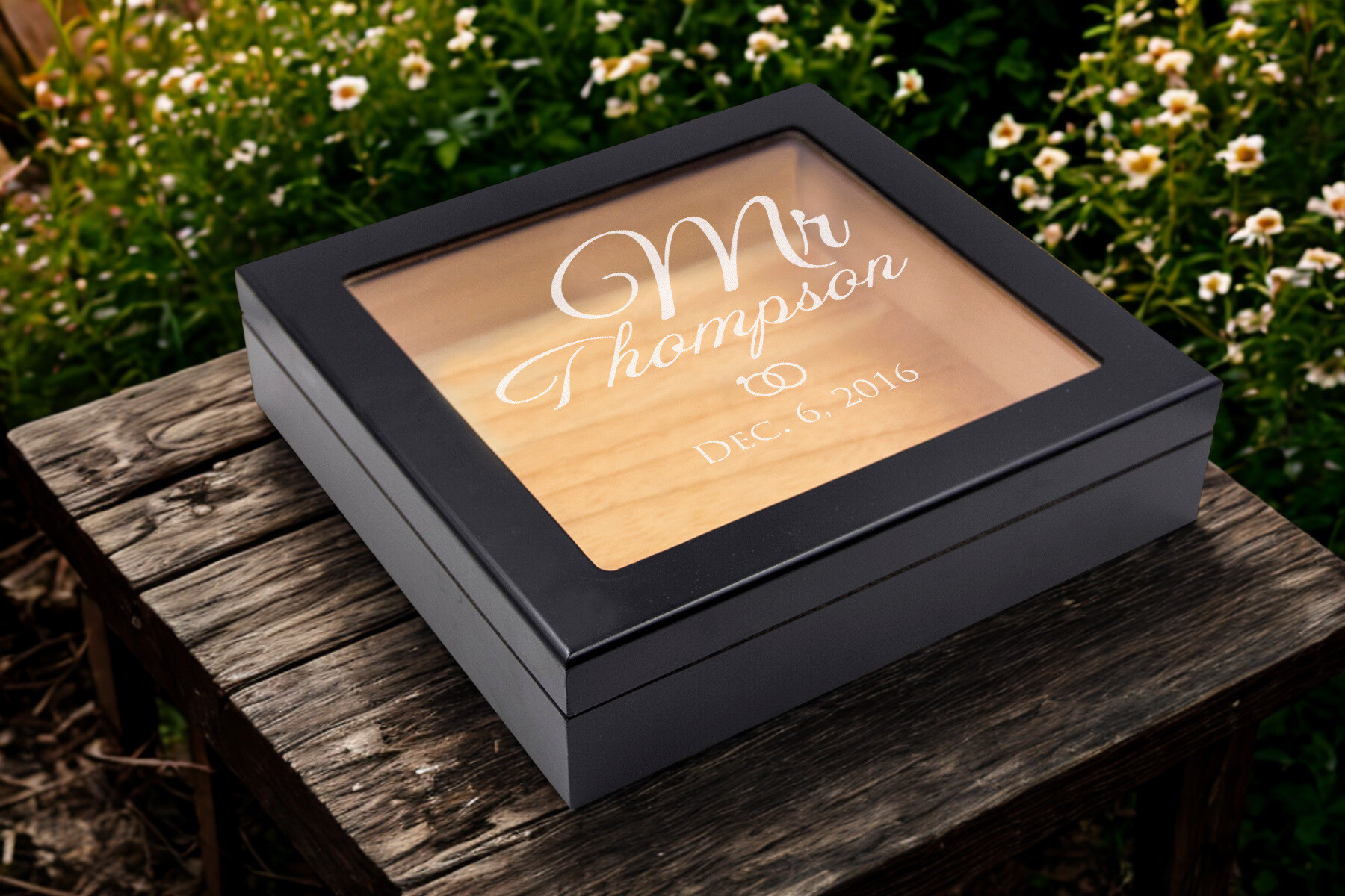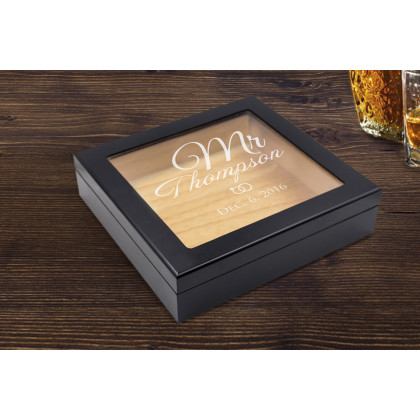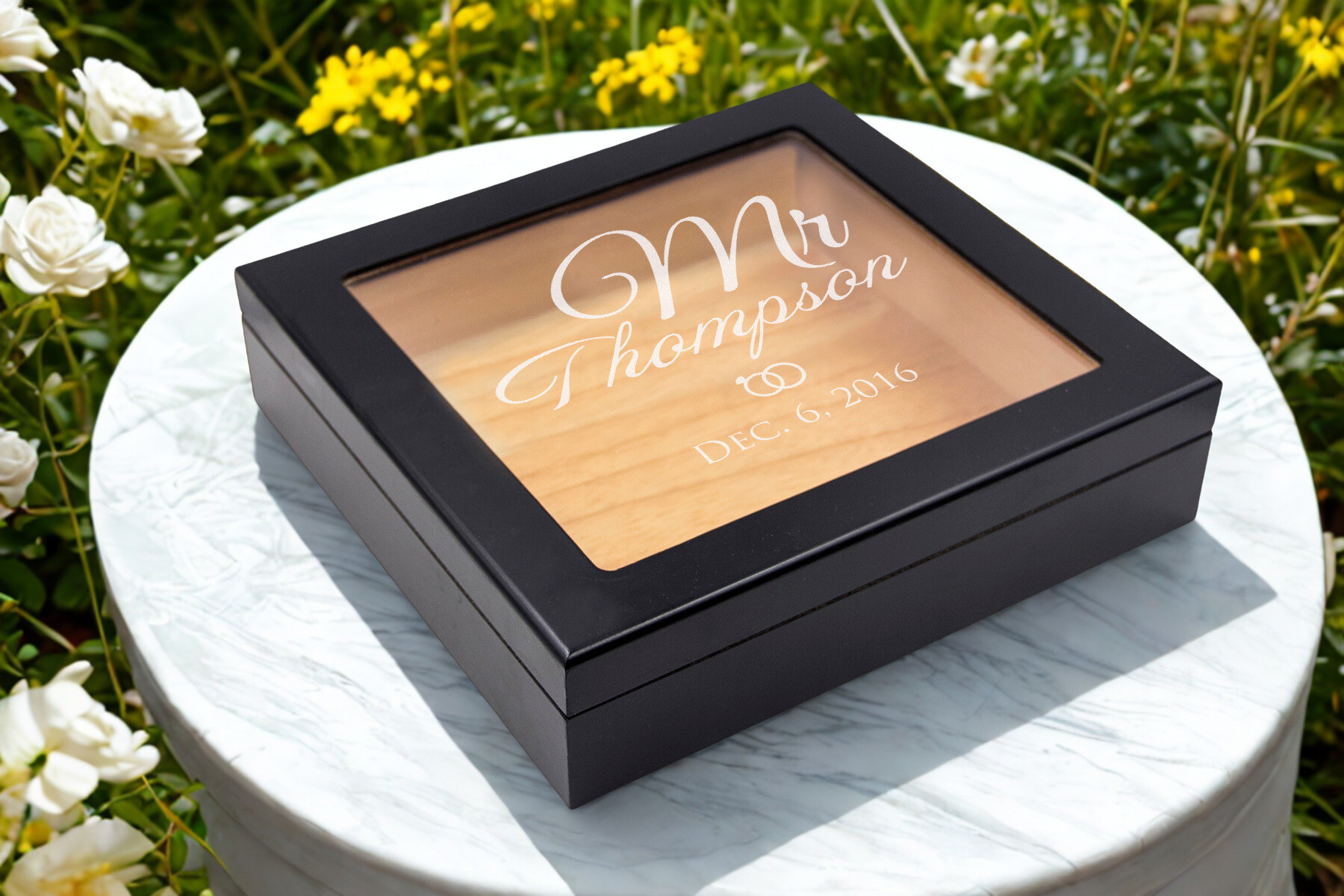 Personalized Wedding 20 Count Black Glass Top Cigar Humidor With Humidifier