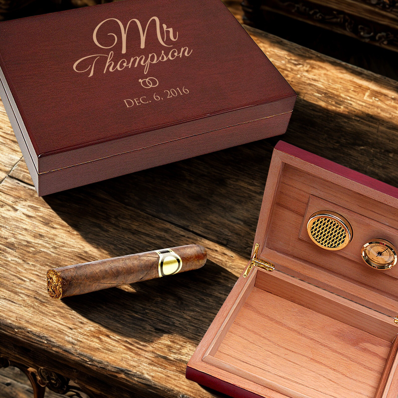 This personalized box is a beautifully crafted, large cigar humidor. It is designed for an occasional cigar smoker who cares about quality and manly looks of his humidor. It can hold maximum 20 cigars at a time. This cigar box oozes class and sophistication. It makes the perfect personalized gift for any cigar smoker. Cigars are natural products, and require special care and protection just like any other perishable item.