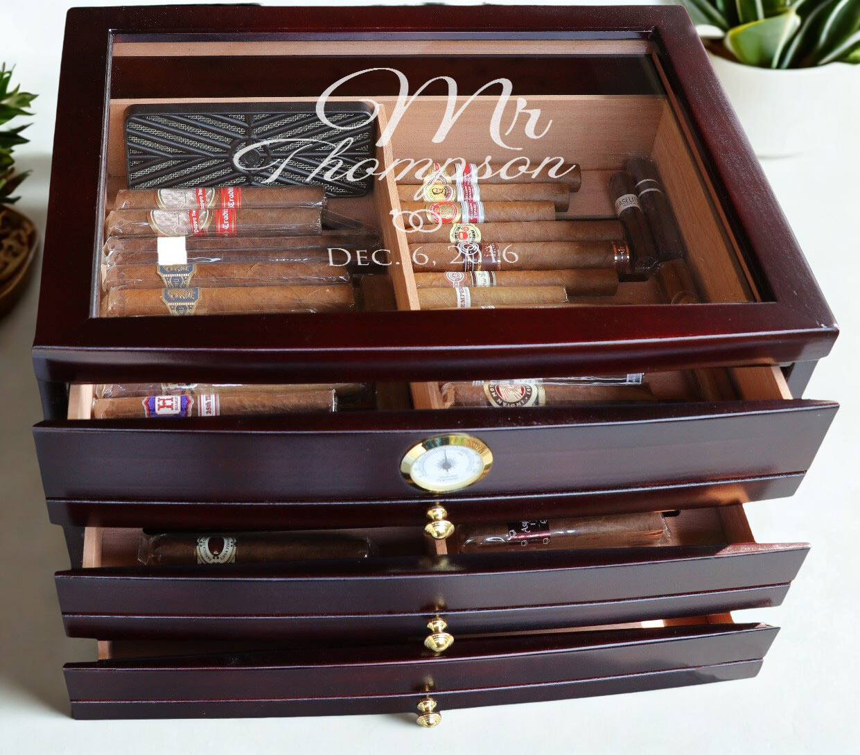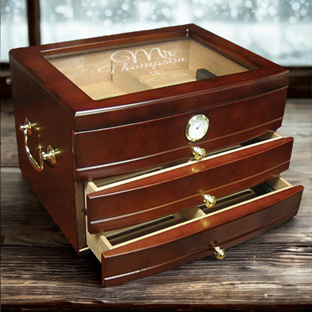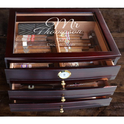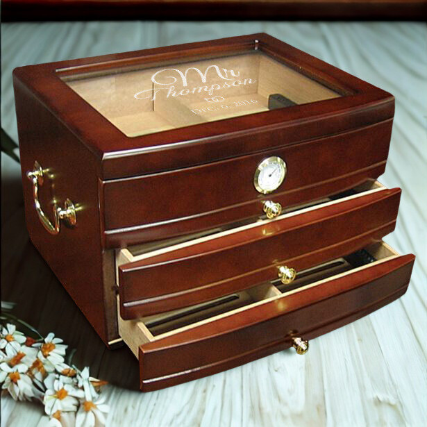 Personalized Wedding Dark Mahogany Glass Top Cigar Humidor With 3 Drawers