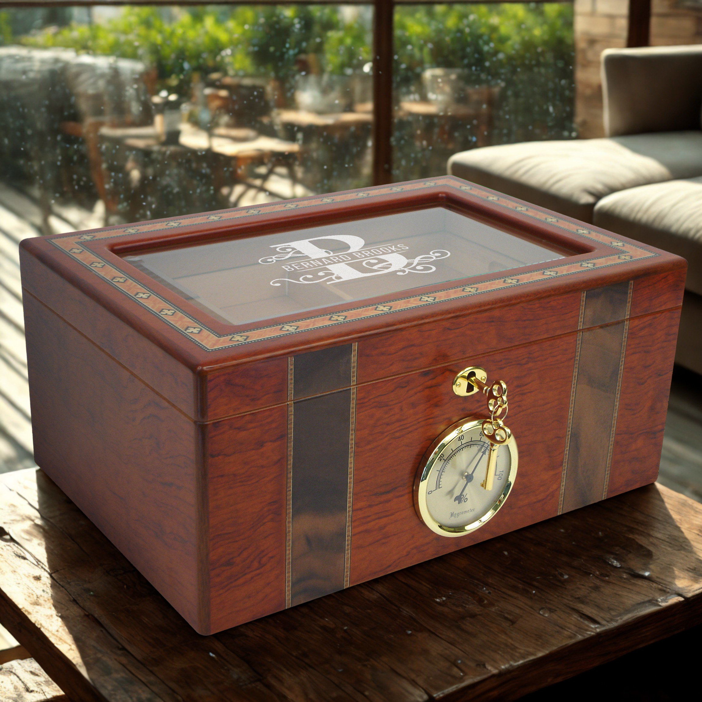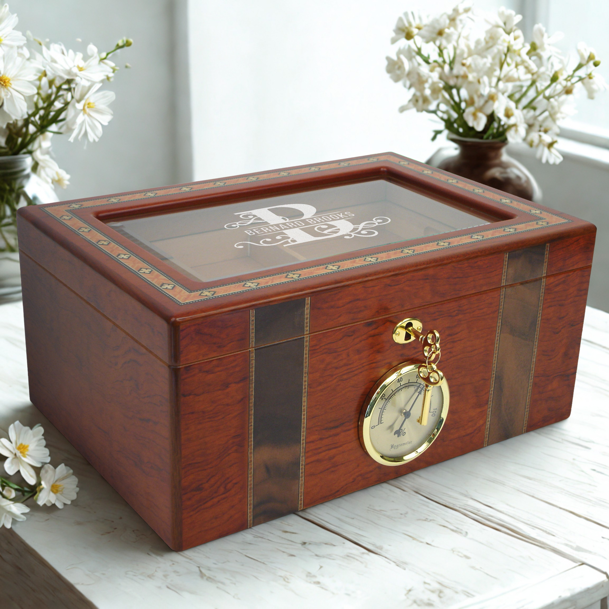 Personalized With Name and Initial 100 Count Beveled Glass Top Ambassador Humidor w External Hygro