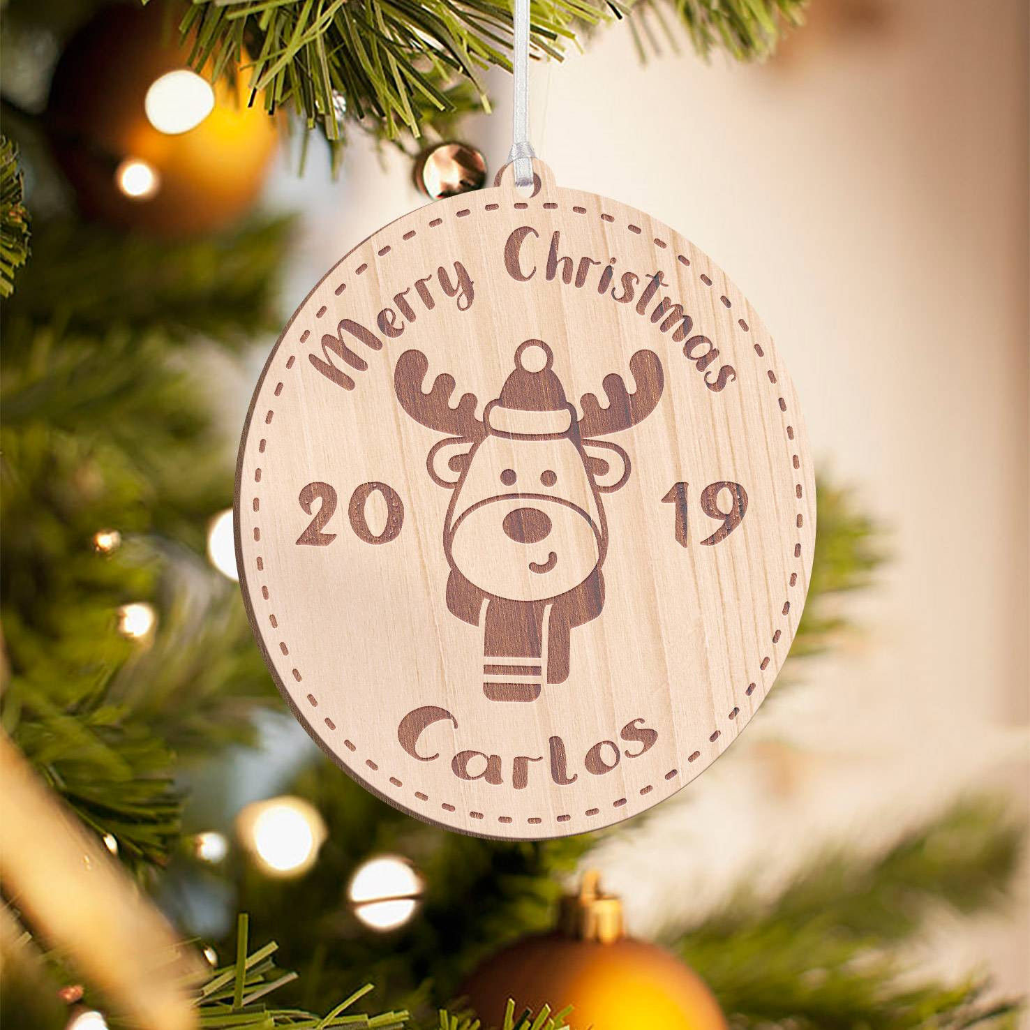 Personalized Wooden Reindeer Head Merry Christmas Ornament