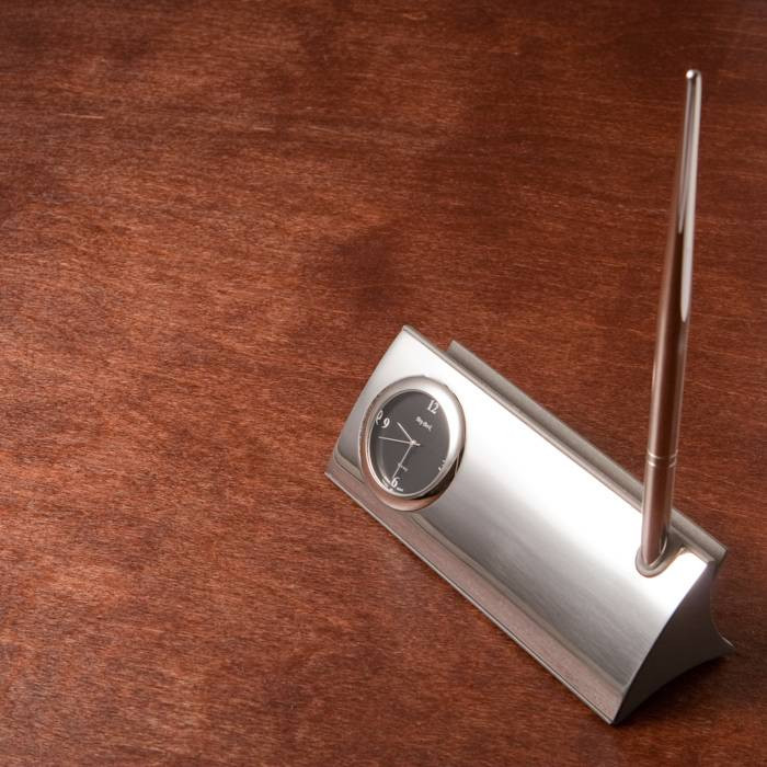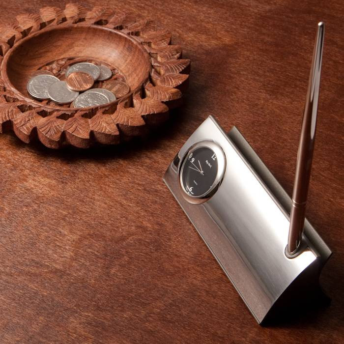 Dress Up Their Desk with a Sleek Silver Clock and Pen Business Card Holder