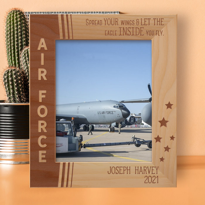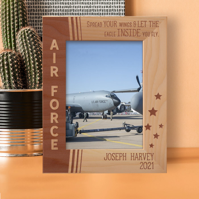 This personalized air force wooden frame is an ideal gift choice because it can easily be put for table top display vertically or horizontally, and hung on the wall as well. This personalized air force frame comes in a variety of sizes and shapes too. Therefore you can display your best photograph with a high-quality frame like this one.