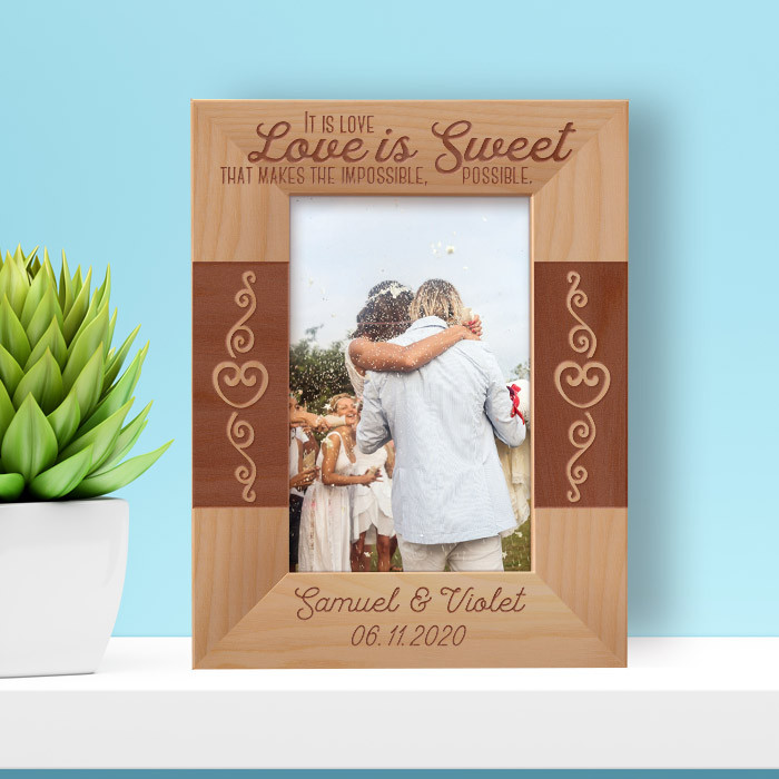 Since it can be personalized, you can add a lovely message to it. This will add more value and meaning to the frame. Ultimately, personalizing it will make your wedding photo look even more spectacular! This personalized wedding frame comes in various shapes and sizes. Also, you can display the wedding frame by hanging it or even making it stand. Displaying a frame has never been this easy!